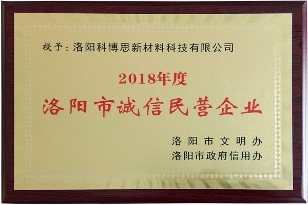 近日,由市文明辦與市政府信用辦舉辦的《洛陽(yáng)市2018年度“誠信經(jīng)營(yíng)企業(yè)”和“誠信建設先進(jìn)個(gè)人”評選活動(dòng)》,經(jīng)推薦遴選和嚴格評審,洛陽(yáng)科博思新材料科技有限公司被授予“誠信民營(yíng)企業(yè)”榮譽(yù)稱(chēng)號。